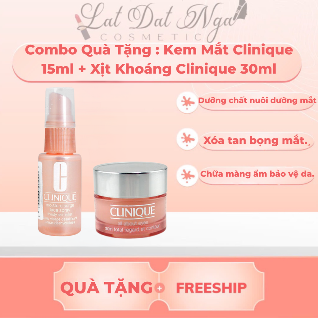 Combo Clinique là set chăm sóc da tiện lợi, nhỏ gọn nhưng hiệu quả vượt trội, kết hợp giữa kem mắt Clinique All About Eyes (15ml) và xịt khoáng Moisture Surge Face Spray (30ml) – bộ đôi hoàn hảo cho làn da mịn màng, tươi tắn và tràn đầy sức sống mỗi ngày.