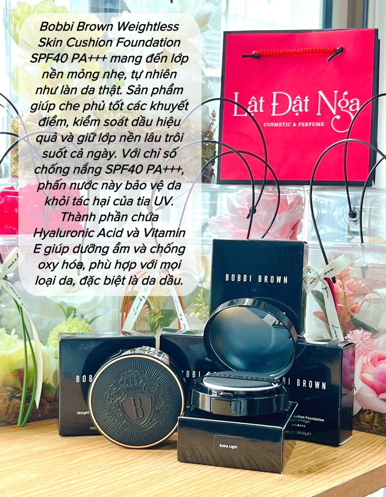 - Bobbi Brown Weightless Skin Cushion Foundation SPF40 PA+++ là một sản phẩm phấn nước cao cấp đến từ thương hiệu Bobbi Brown nổi tiếng. Sản phẩm này được thiết kế để mang đến lớp nền mỏng nhẹ, tự nhiên như làn da thật, đồng thời vẫn đảm bảo độ che phủ tốt và khả năng bảo vệ da khỏi tác hại của ánh nắng mặt trời. Với công thức tiên tiến, phấn nước này giúp kiểm soát dầu thừa, giữ cho lớp nền lâu trôi và không bị bóng nhờn suốt cả ngày dài. Thiết kế cushion nhỏ gọn, tiện lợi giúp bạn dễ dàng mang theo và sử dụng sản phẩm ở bất cứ đâu.