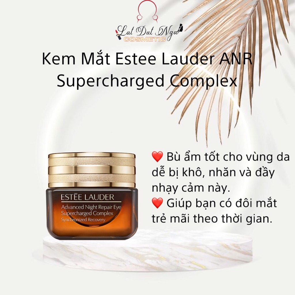- Kem mắt Estee Lauder Advanced Night Repair Eye Supercharged full size điều trị toàn diện mọi vấn đề trên vùng da quanh mắt như quầng thâm, bọng mắt, nếp nhăn, giúp tái tạo đôi mắt rạng ngời và trẻ trung. Bảo vệ vùng mắt trước tác hại ô nhiễm môi trường, lão hóa và cả sự căng thẳng trong công việc. Sự kết hợp giữa Công Nghệ ChronoluxCB™ và giúp bảo vê da trước mọi tác hại từ môi trường.