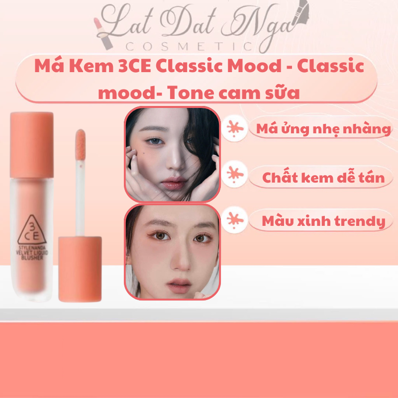 - 3CE Velvet Liquid Blusher – Classic Mood Tone Cam sữa nhẹ nhàng, cổ điển tạo nên đôi má mềm mại, tươi tắn suốt cả ngày.