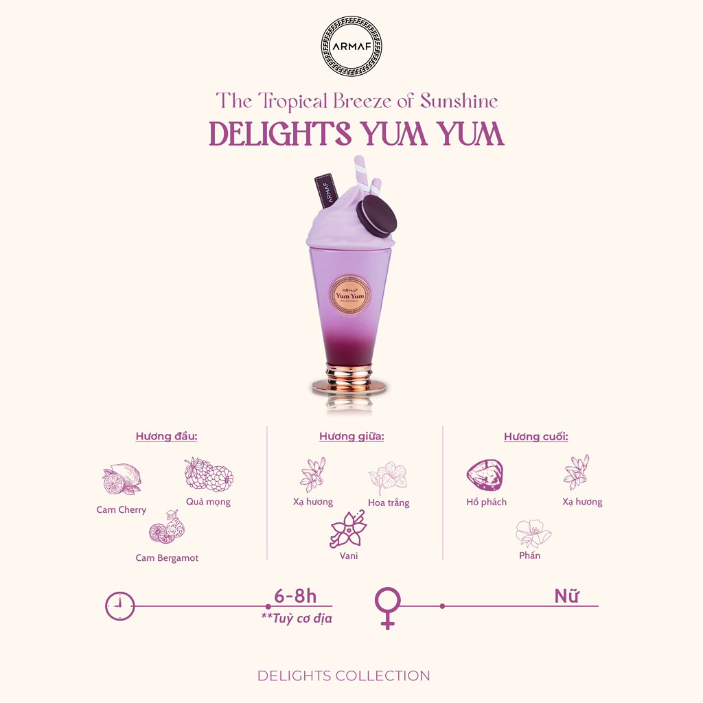 Armaf Yum Yum Armaf EDP 100ml mang đến một hành trình hương thơm phong phú, mở ra sự tươi mới, tiếp nối bằng sự ngọt ngào và khép lại với sự gợi cảm tinh tế. Sự kết hợp tươi mát, mọng nước của cam Bergamot, quả cherry và quả mọng tạo nên sự khởi đầu rực rỡ, như những viên kẹo ngọt lịm kích thích mọi giác quan. Điểm nhấn quyến rũ với vani, hòa quyện cùng sự mềm mại của hoa hồng và sự tươi mát của hoa trắng, mang lại cảm giác lãng mạn và đầy nữ tính. Tầng hương cuối ấm áp và lắng đọng của h.ổ phách, xạ hương và nốt phấn nhẹ nhàng, để lại dấu ấn khó quên trên làn da suốt cả ngày dài. Với khả năng lưu hương từ 6-8 giờ, Yum Yum thích hợp cho mọi hoàn cảnh, từ những buổi hẹn hò lãng mạn đến các sự kiện vui nhộn.