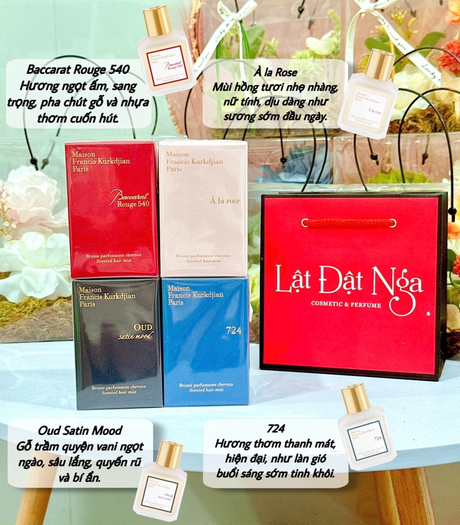 - Nước hoa xịt tóc Maison Francis Kurkdjian Paris 70ml (MFK) mùi hương nước hoa đình đám nhất của nhà Baccarat hãng đá quý danh tiếng. Maison Francis Kurkdjian Paris 70ml (MFK) nhưng lại có thành phần dưỡng tóc. Chỉ cần làn gió nhẹ làm tóc khẽ tung lên, hay chỉ một cái nghiêng đầu tóc buông rơi cũng làm người kế bên lưu luyến vì mùi hương này.