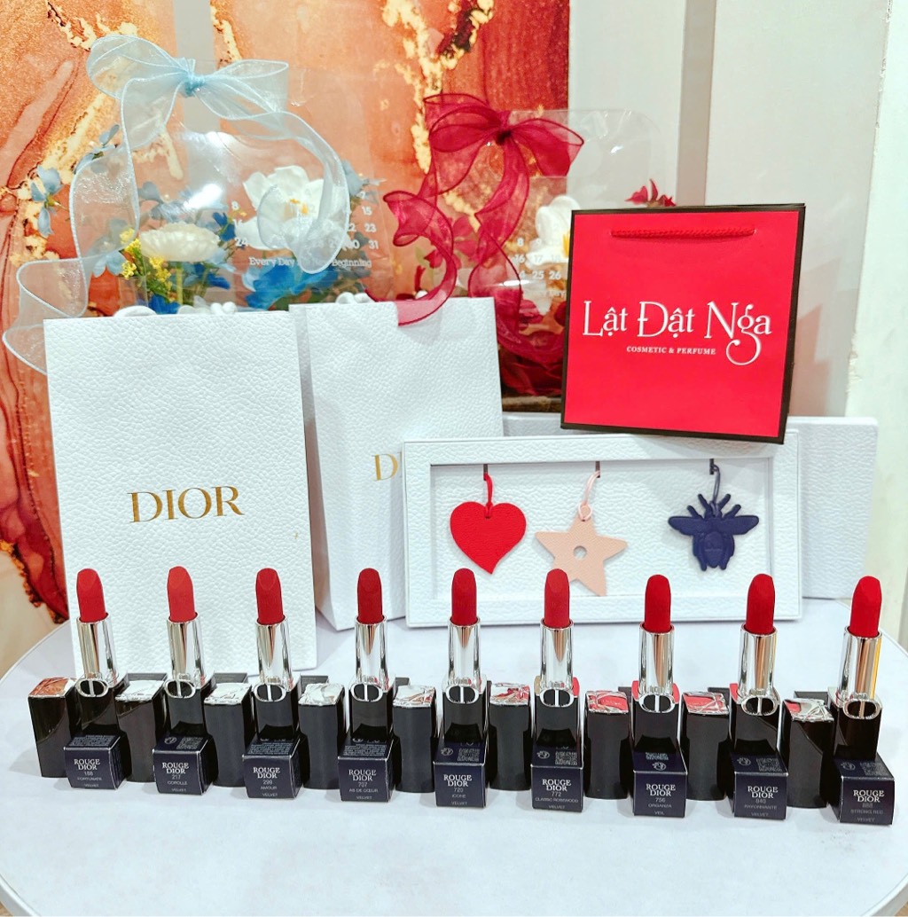 - Dòng son Dior Rouge Velvet là một lựa chọn hoàn hảo cho một đôi môi thêm phần quyến rũ. Chất son vô cùng mịn và lì nhưng lại không sợ bị khô môi.