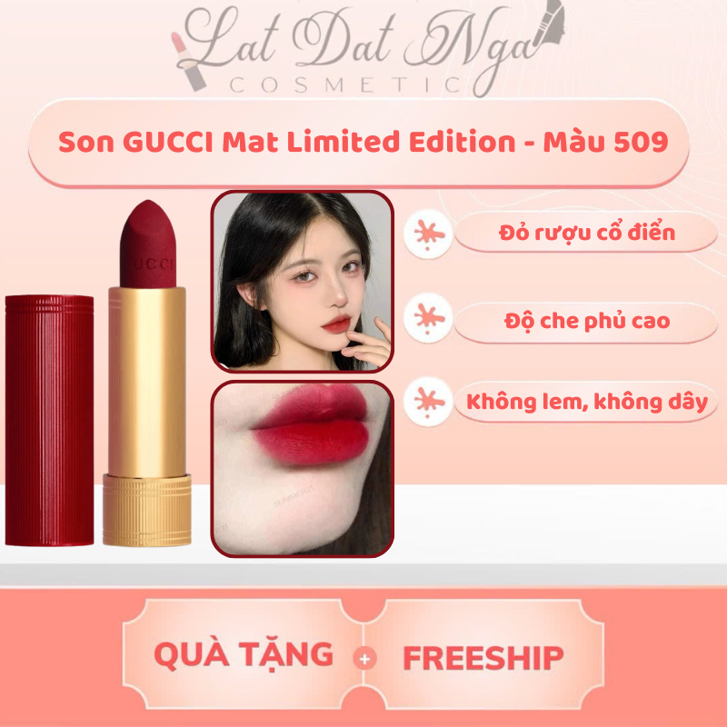 - Công thức son môi Rouge à Lèvres Mat Gucci mang lại màu môi tươi sáng và phong phú với cảm giác mềm mại và mượt mà. Nó có kết cấu giống như lụa được làm giàu với dầu và sáp tạo gel cho một lớp nền thoải mái mà không làm khô môi hoặc lem màu.