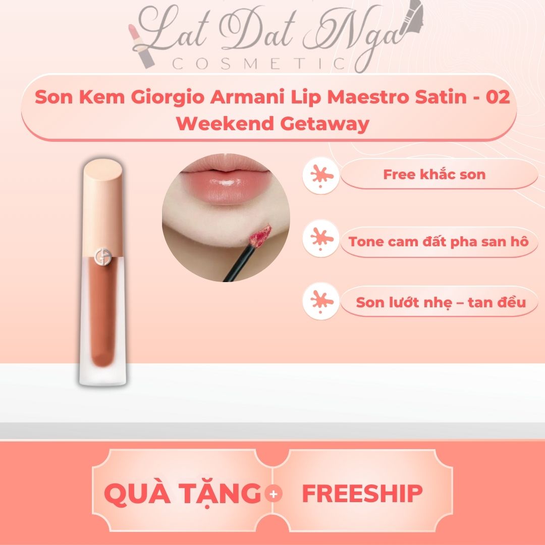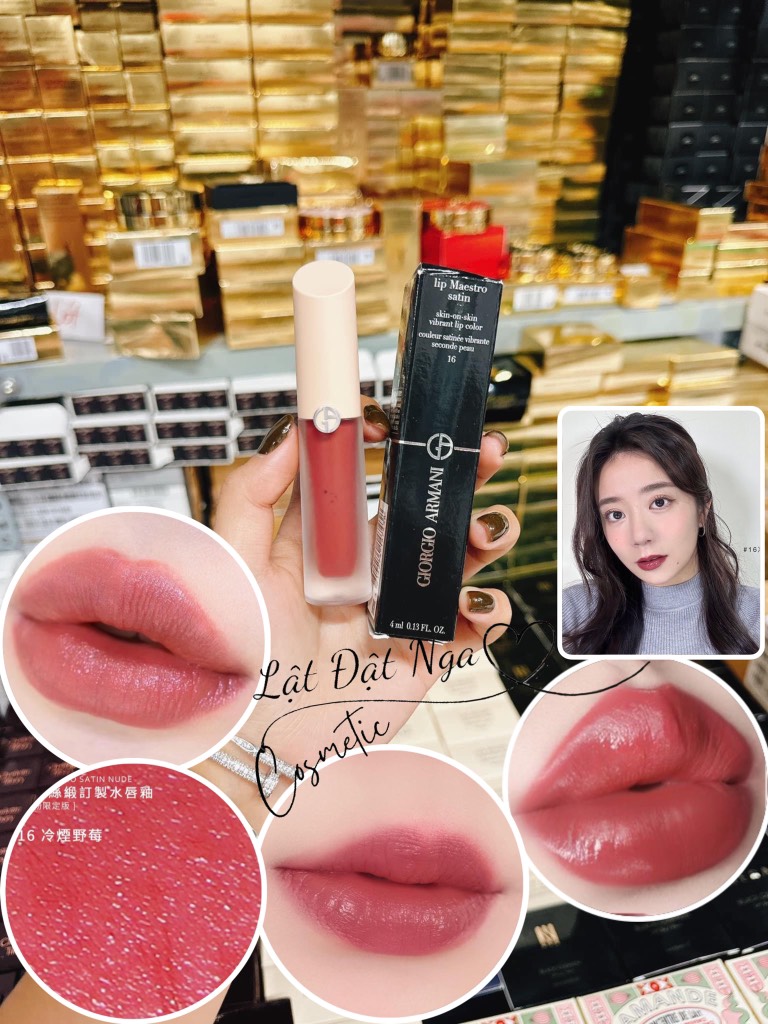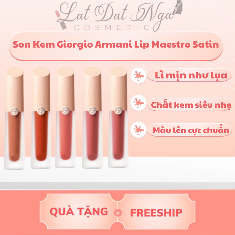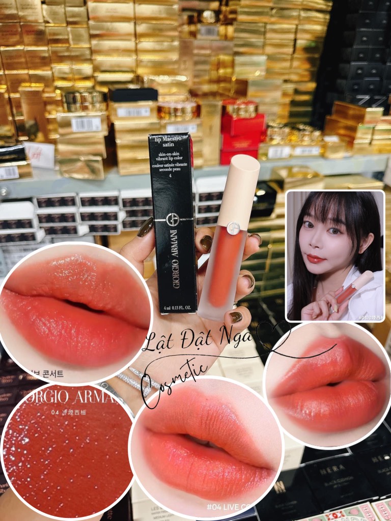 - Son Kem Giorgio Armani Lip Maestro Satin là dòng son kem nhưng chất rất nhẹ, lên môi mềm, hơi bóng ban đầu để giữ ẩm cho môi và tránh tình trạng khô bết son. Sau đó mới tiệp và lì dần. Set chặt trên môi đúng chuẩn. Quan trọng nhất là son không bị nặng môi, và cũng không gây khô môi hay đọng vân môi.