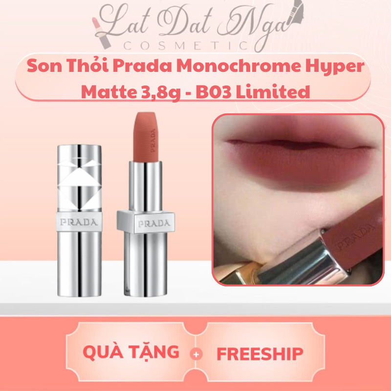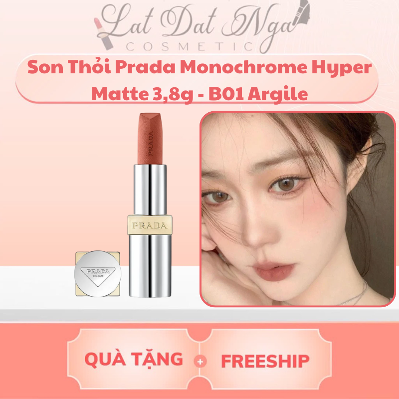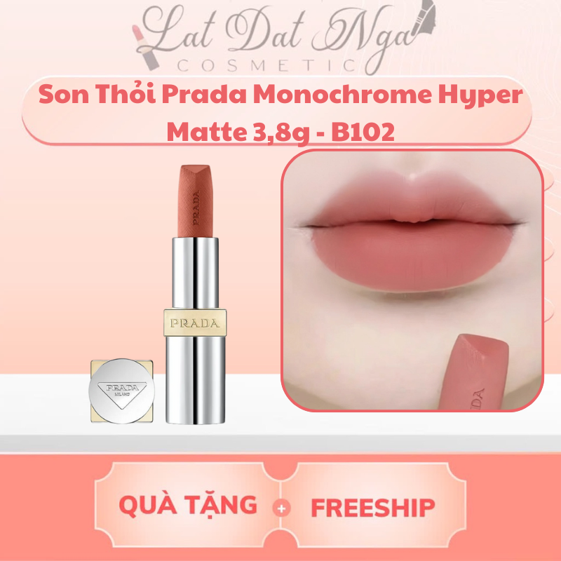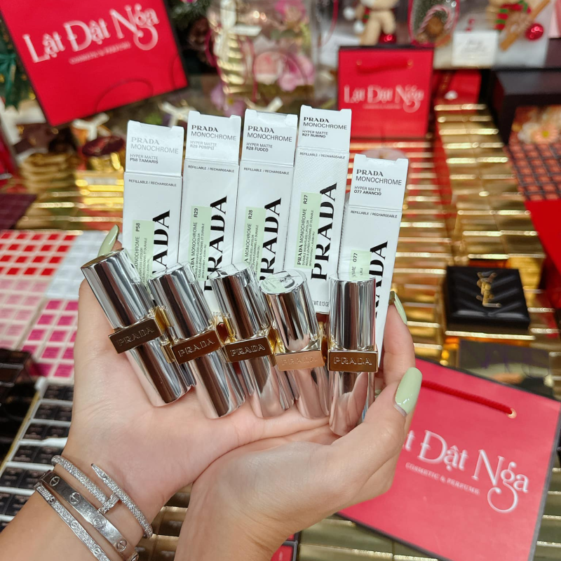 - Prada Monochrome Hyper Matte là dòng son thỏi lì với thiết kế bằng kim loại nguyên khối màu bạc kim sáng bóng siêu sang chảnh cùng với thiết kế nắp nam châm chắc chắn vô cùng sang trọng