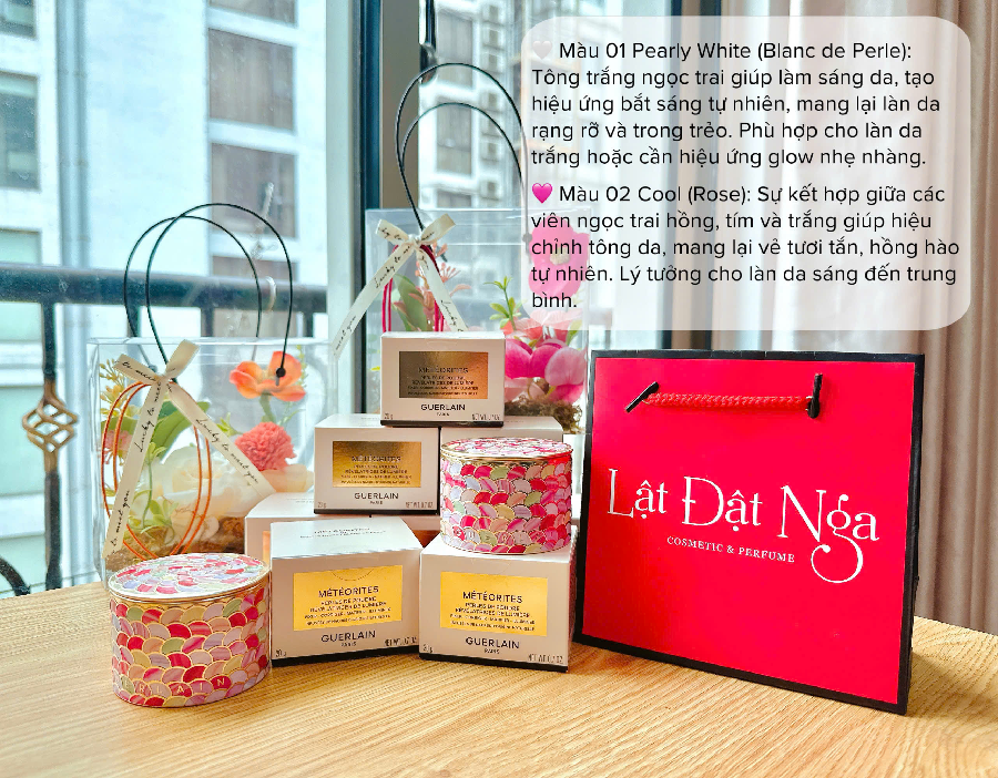 - Phấn Meteorites dạng viên mang lại làn da bắt sáng rạng rỡ và mỏng mịn tự nhiên như của phấn phủ Meteorites ngọc trai với 5 màu sắc có 5 công dụng trong 1 sp. Mỗi màu sắc có 1 công dụng riêng:
