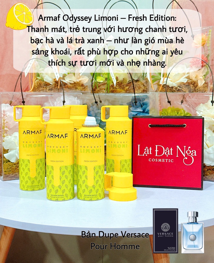 Xịt thơm Body Armaf Odyssey Edition 200ml là một sản phẩm xịt thơm toàn thân đầy năng động và tươi mới đến từ thương hiệu Armaf danh tiếng của Dubai. Được thiết kế dưới dạng xịt phun sương tiện lợi, sản phẩm này mang đến trải nghiệm sảng khoái tức thì, thích hợp cho cả nam và nữ. Với dung tích 200ml, Xịt thơm Body Armaf Odyssey Edition 200ml hứa hẹn sẽ là người bạn đồng hành lý tưởng, giúp bạn tự tin và tràn đầy năng lượng suốt cả ngày dài. Sản phẩm này không chỉ đơn thuần là một loại xịt thơm, mà còn là biểu tượng của phong cách sống năng động, hiện đại, dành cho những ai yêu thích sự tự do và phóng khoáng.